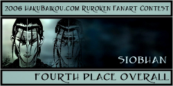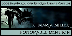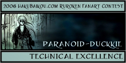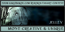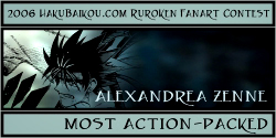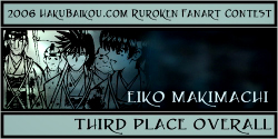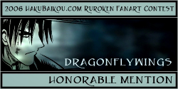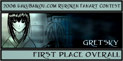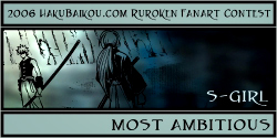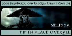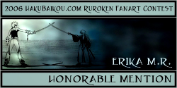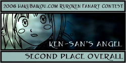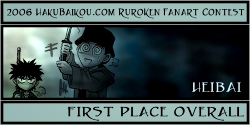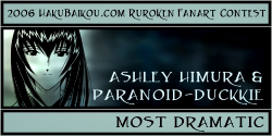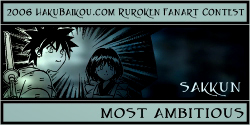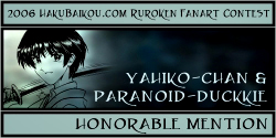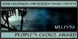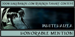 - I really like having a People's Choice Award in which visitors to hakubaikou.com can have a say in who gets an award. And it's pretty obvious why this picture was chosen. It's very beautiful, it's done in a really great unique style, and it chooses a moment in the RK time-line that is one of the most memorable, I think, for many people. Battousai summoned by Jinei, and then Kaoru bringing Kenshin back to himself. It's such a dramatic moment, and it's captured beautifully here.