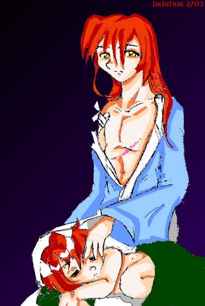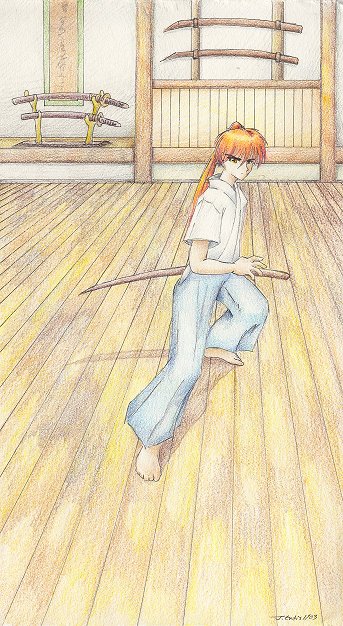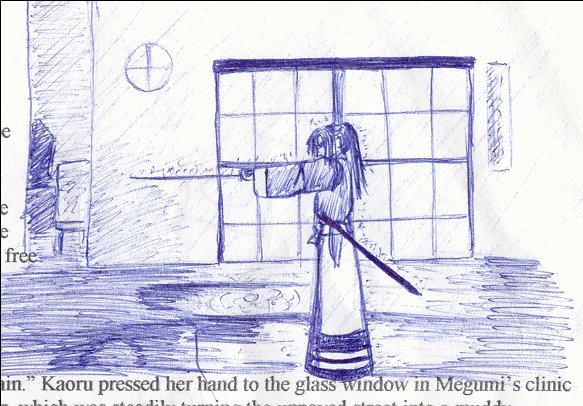 slamming into the wall. Regaining his balance he came running toward Kaoru,
