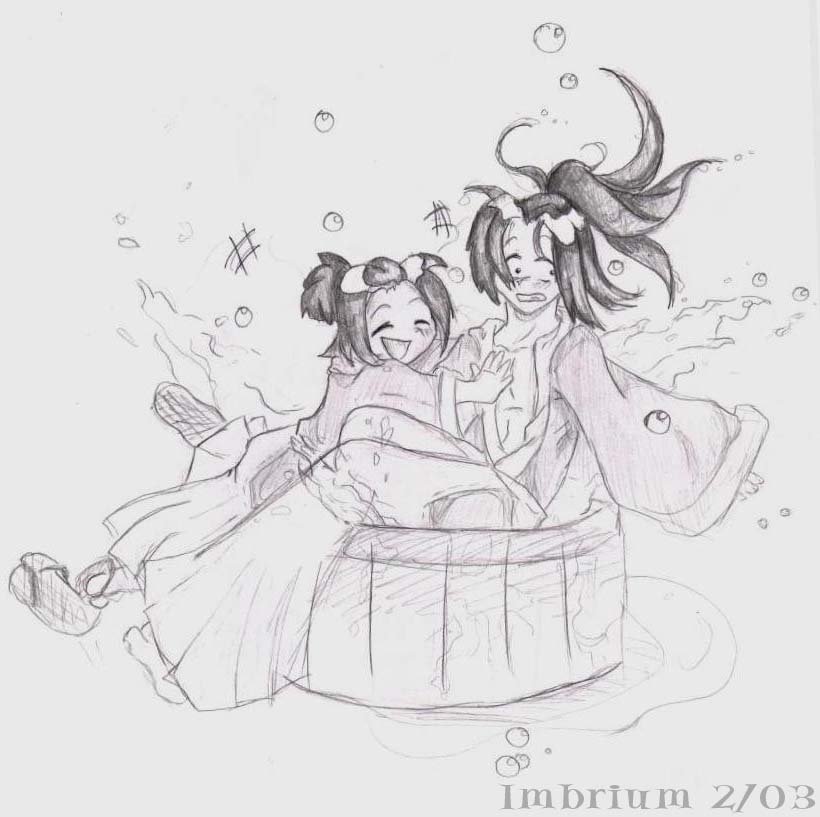 almost lost in the twisted fabric of his yukata, probably one of Yahiko's,